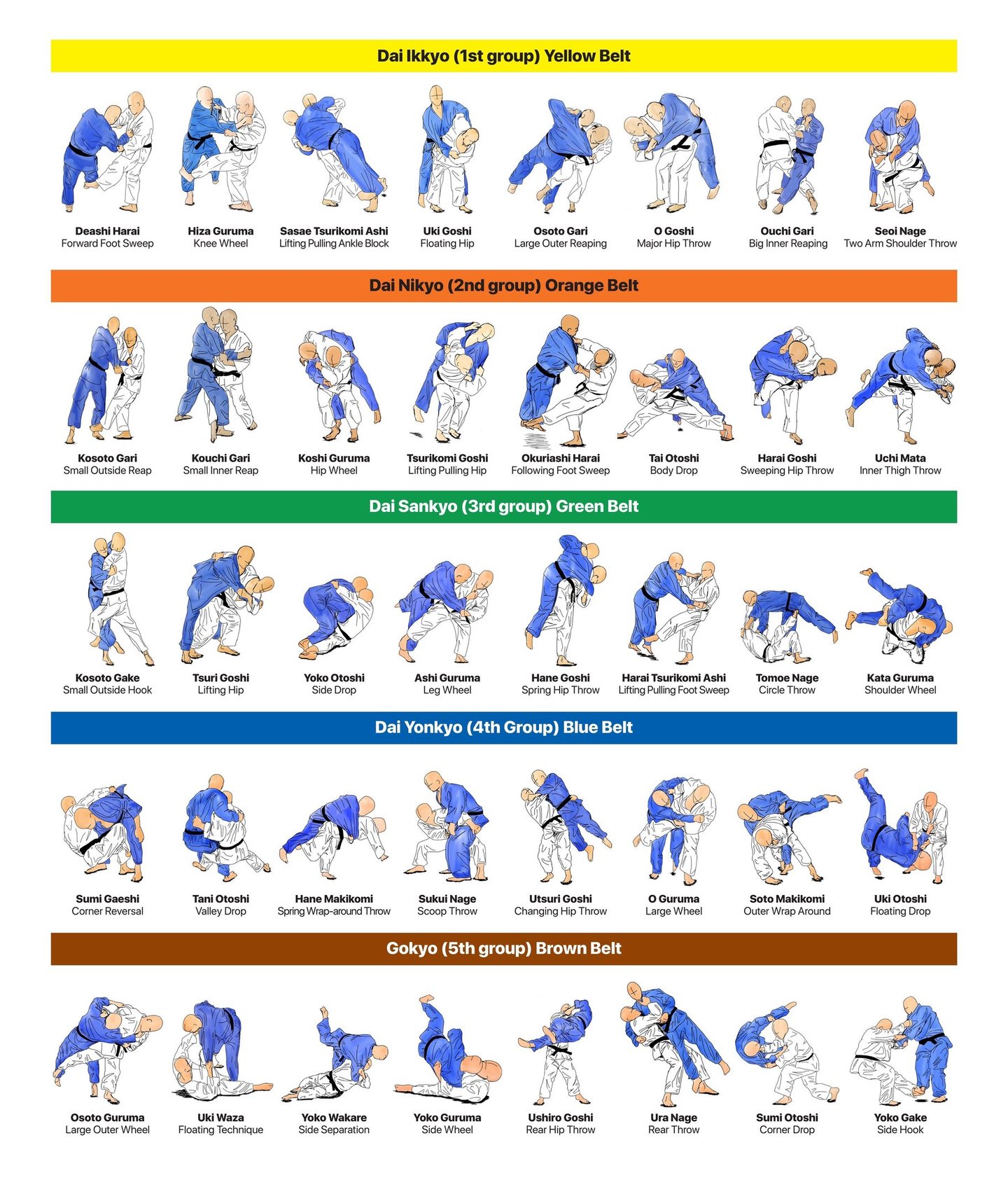 A brief overview of the expected proficiency at each belt rank: