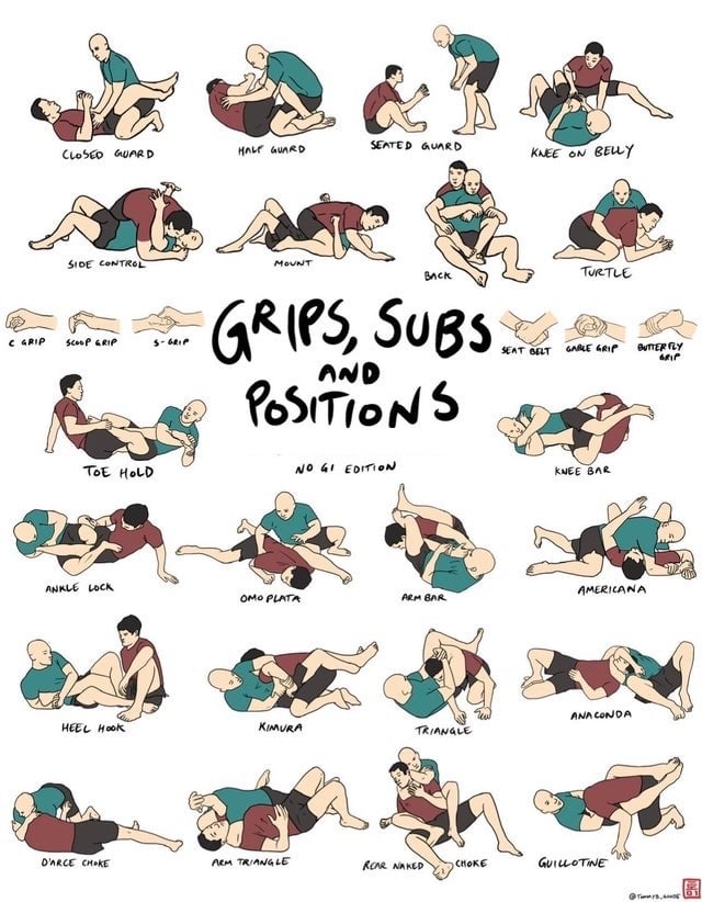 This illustration brings together the core elements of Jiu Jitsu—grips, submissions, and positions—into one cohesive visual for better understanding and application.
