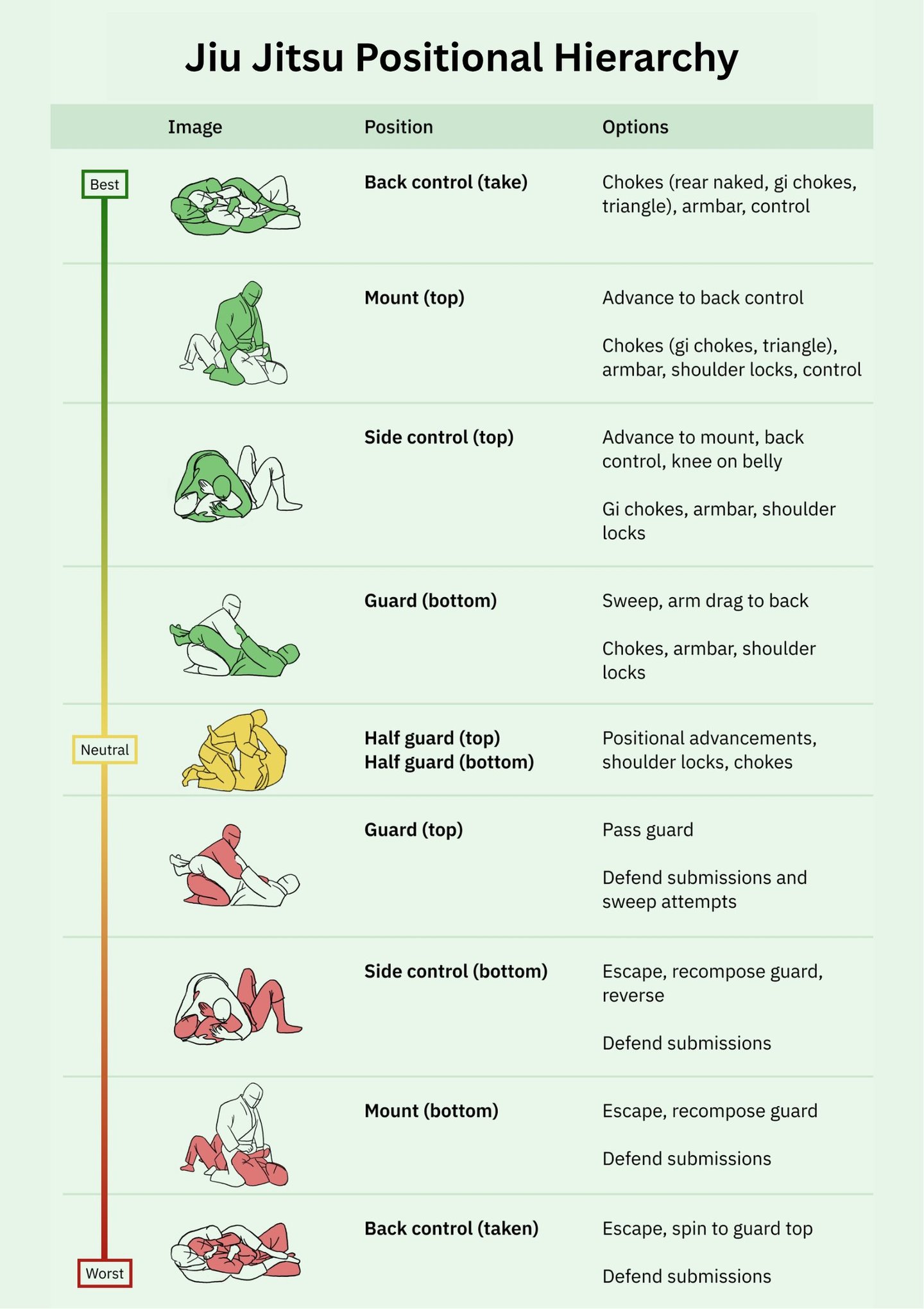 Understanding the positional hierarchy is key to success in Jiu Jitsu. This chart illustrates the main positions ranked from most dominant to least favorable, providing a clear roadmap for what to strive for during training. Mastering transitions between these positions is fundamental to improving control and effectiveness on the mat.