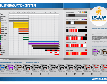 Belts in Jiu Jitsu serve as a general indicator of progress, providing a way to evaluate a practitioner’s skills and experience within the context of the belt system. The belt structure outlined below is based on the standards set by the International Brazilian Jiu Jitsu Federation (IBJJF), widely regarded as the leading authority in Brazilian Jiu Jitsu. While the belt colors and progression system are commonly followed across most academies, the specific timeline and criteria for promotion vary depending on each academy’s grading policies and evaluation methods.